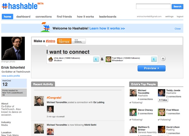 The service is still in private beta, but the first 2,000 people to follow @hashable on Twitter will get an invite into the service. You can also claim your profile after being introduced to someone else by an existing member. Hashable lets you make introductions in three simple ways, through Twitter, email, or its website. (iPhone and Android apps are in the works).