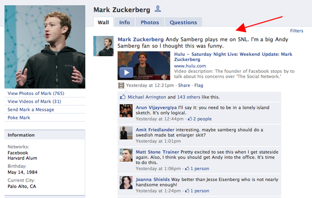 After this weekend’s Saturday Night Live/Facebook double header, Facebook CEO Mark Zuckerberg posted a Hulu link on his Facebook profile pointing to his faux guest appearance on “Weekend Update,” with the status “Andy Samberg plays me on SNL. I’m a big Andy Samberg fan so I thought this was funny.”