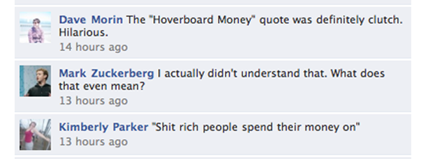 Well, maybe Zuckerberg didn’t find all of it funny, as he does expresses some confusion about the “hoverboard money” part, which former Facebook Senior Platform Manager and current Path co-founder Dave Morin found “definitely clutch” (Kimberly Parker helpfully explains). But hopefully Zuckerberg’s appreciation of the skit means we will see a less annoying alternative to poking in the near future.