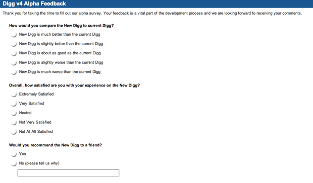 It seems as though post-revolt Digg is now treading carefully with regards to user feedback, to the point of providing users with a full-on survey regarding Digg Version 4 changes. Early reaction from users is mixed with the basic sentiment being “too little too late.”