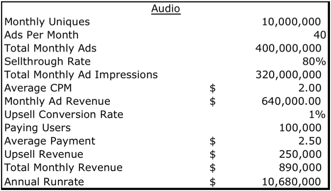 As I wrote in the Teardown on Pandora, consumer audio/radio startups are difficult to monetize because they are typically amongst the lowest-valued forms of advertising. It makes sense because audio ads are not actionable, and display ads often get ignored (music apps tend to stay open in a browser tab in the background). The other challenge to audio companies is access to cost-effective content—music rights are difficult to secure and typically cost-prohibitive. Pandora has shown that a sustainable business can be created, but it also takes huge scale (10 million+ users) to reach that critical point. If you can attract 10 million unique listeners a month and show them 40 ads each at a $2 CPM, plus you can convert 1 percent of those into paying users of some kind and squeeze out an extra $2.50 from each of those, then you can get to $10 million in annual revenues.