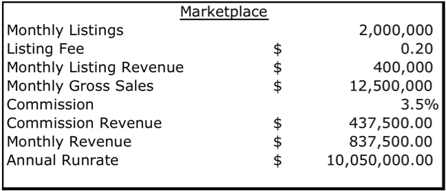 As I wrote in detail in the Teardown on hand-made goods marketplace Etsy, online marketplace companies create efficiencies between buyers and sellers that are difficult to achieve in the real world. The leading online marketplace is eBay, which happens to run the default sale process as an auction, but fixed price sales have emerged as competitive due to their simplicity and ease of use. Marketplace companies make money by getting as many people as possible to put their goods up for sale and charging a nominal fee for those listings. The more products available for sale the more buyers are attracted to the platform, and the higher the likelihood that a sale will be consummated, generating a commission for the company. Due to the network effects of marketplaces and small fees, these businesses are notoriously difficult to achieve critical mass and take a long time to build. But once they do, these companies tend to have a long, profitable existence. Newer listing companies, like AirBnB, which focus on higher price points ($100+), may achieve scalability faster than traditional product marketplaces. In my financial analysis below, I estimate that a typical marketplace would require 2 million listings a month generating gross sales of $12.5 million a month in order to achieve $10 million worth of annual fee and commission revenues for the marketplace itself.