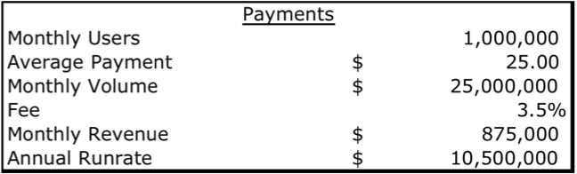 Payments are a volume-based business. These companies are charging pennies for each transaction that flows through their systems, so the biggest drivers of these kinds of businesses are the number of customers that have access to your payment method and the size of the average transaction. The characteristics that make up a good payments or financial services company are the number of high-quality distribution deals you can enter with a customer base that has demonstrated it will pay for goods and services. You need one million customers a month making payments of at least $25 to get to $10 million in annual fee revenue, assuming a 3.5 percent fee.