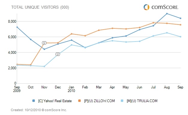 Traffic to the site is up more than 50 percent from last year, up to 9 million unique visitors a month, according to Flint. ComScore estimates a smaller number—6 million U.S. visitors in September—but even stronger growth of 155 percent (Zillow grew even faster at a 200 percent annual clip to 7.6 million uniques, so it’s not just Trulia that is doing well here). Trulia’s growth comes from expanding its listings to rentals earlier this year, and in general trying to help people make smarter real estate decisions with all sorts of tools and data.