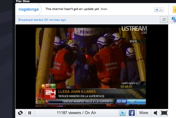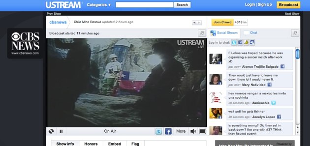 By now you’ve doubtless heard about the ongoing rescue of 33 Chilean miners, who have been tragically trapped 2,000 feet underground since August 5. After months of waiting, the miners are being rescued one by one (as of this writing three are still below ground), and media organizations are broadcasting the footage of the recue effort live to a reported 1 billion people. That massive worldwide audience has led to some new records for live-streaming service Ustream, which has been broadcasting feeds from media organizations around the world.