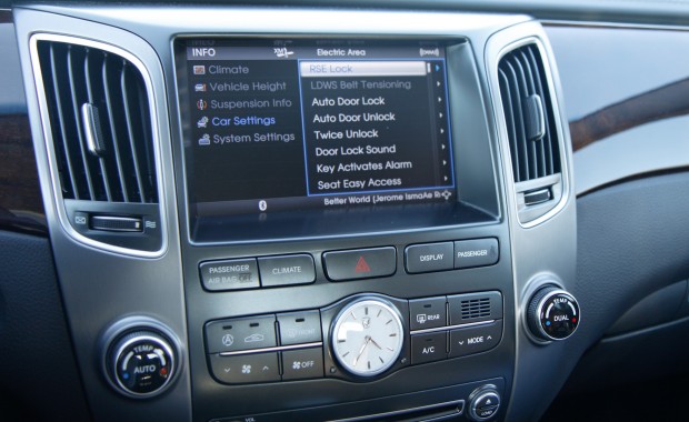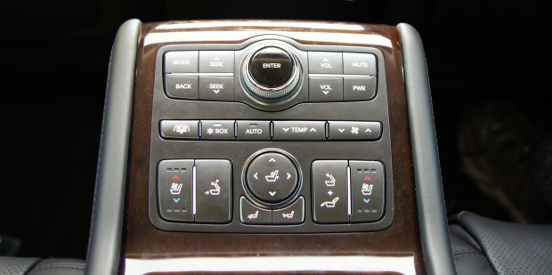 With the smartkey in your pocket, lightly touch the inside of the door handle; Equus unlocks and prepares for your arrival. With nothing more than the push of a button, your Equus boots with a wonderful chime and a muted engine note — you would swear it didn’t start. The usual steering and seating circus act commences and you’re brought into command position. Look to the high-res display and you can control your music (XM, Aux-in with iPod/iPhone dock, 6-disc CD/DVD), navigation and communication device; all from a single rotating knob situated underneath the shifter. The interface is fast and intuitive—although a bit more speed wouldn’t hurt—but the menu navigation is quick and straight to the point. Lighting, notifications, seatbelt pretensioners, and other options can also be accessed via the click wheel.