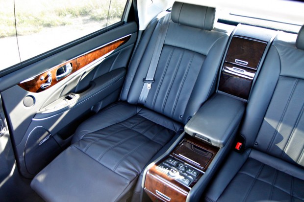In the rear of the ‘Ultimate’ Equus, you’ll find another cockpit, this time designed as a sort of recliner for a lucky VIP taking a ride in this car. The rear is the most unique in its class and certainly among others of similar price. Press one button and the front passenger seat moves and folds forward — after all, you only need space for yourself, the driver and your assistant. After the front seat is recessed, the rear passenger seat begins to recline and a footrest appears — yes, like a La-Z-Boy. To the left you’ll find a cool box that works quite well. Above that there is a flap covering a storage area that holds the remote for the rear seat massage.