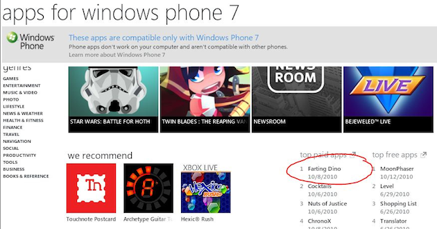 I don’t know what’s better: the fact that an app named Farting Dino is the first hit for Windows Phone 7, or that it’s a paid app, and people are actually paying for it. iPhone users have long been in love with fart apps, but almost all of them have been free. Perhaps Windows Phone 7 really is going to change the space.