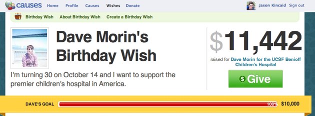 Today, we’ve gotten word that the service has set a new record: Dave Morin, a long-time former Facebook employee who is now CEO of stealthish startup Path, managed to raise over $10,000 in 24 hours, which is the fastest-growing Birthday Gift ever (the total totally is now up to over $11K). He’ll be donating the proceeds to UCSF Benioff Children’s Hospital in San Francisco, and if you’d like to participate you can find his Wish here. Morin’s success with Birthday Wish is awesome news, but it’s also important for another reason: it shows how some recent tweaks to the Causes platform are beginning to take off.