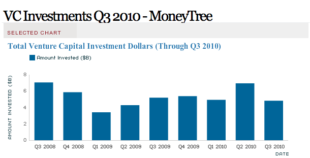 For all the hair-pulling that too much venture money is being thrown at startups, the third quarter actually saw a 31 percent sequential drop in venture dollars invested in the U.S., according to a new MoneyTree report from PriceWaterhouseCoopers and the National Venture Capital Association (see charts here). In the third quarter, VCs invested $4.8 billion in 780 deals, down from $6.9 billion in 962 deals during the second quarter (note that they reported slightly different numbers at the time, but I am using updated numbers here). Even compared to the third quarter of 2009, VC dollars are down 8 percent.