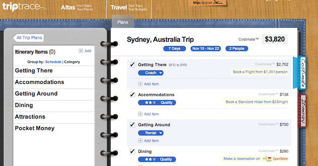 In the Travel book, you can use any of the things you’ve clipped to help you get a costimate for a trip to that particular city. While this obviously isn’t exact, something like this is very helpful when determining if a trip is even feasible in the first place. TripTrace pulls information on things like flights and hotels based on your current location and dates you want to travel.