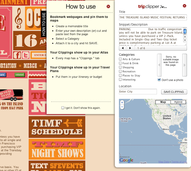 The key to TripTrace is that it makes the complicated notion of travel planning relatively simple. They do this both by making the process a more visual experience, and with a series of tools. One of those is a TripClipper bookmarklet. With it, you can easily take notes as you’re browsing around the web, to bookmark things you find that you might like to do on a trip. Maybe you’re reading an article on a good restaurant in Paris, for example. With the bookmarklet, you can highlight what you want to save and it will be stored in your TripTrace books.