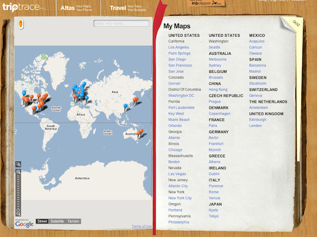 PlaceBook is now known as TripTrace. Still in private beta, it’s a service that allows you to note places around the world you’ve been to. And places you’d like to go to in the future. All of this is done in two books (dare I call them “Place Books”?): your Atlas (places you’ve been), and your Travel (places you want to go). There’s a heavy emphasis on maps in these books, and all of your places are marked by pins (red for where you’ve been, blue for where you’re going).