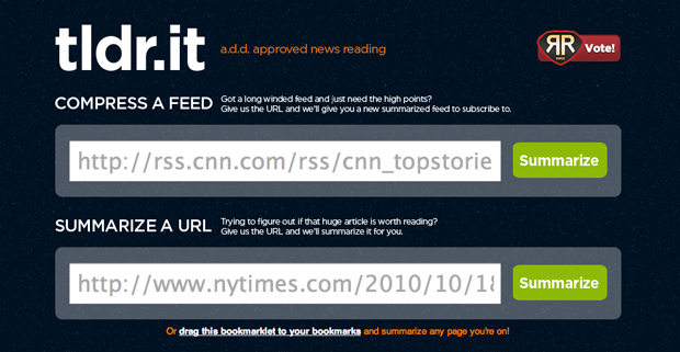 TLDR.it is a web application that summarizes long winded articles and even longer winded RSS feeds into small, medium and long versions for those of us with truncated attention spans. “When I’m reading a story on CNN or NY Times, I want to know more than the high points but don’t want to read 6 pages of text,” says creator Jeremy McAnally. Word.
