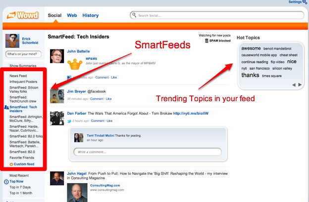 With SmartFeeds, Wowd now creates custom feeds on your behalf by looking at all of your friends, and clustering them together based on communication patterns between them. Your family members might show u in one feed, your co-workers in another, and your college friends in a third. Each SmartFeed also shows a tag-cloud of hot topics being discussed by that group (click on a hot topic such as “venture capital” or “Benoit Mandelbrot” and you’ll see all the messages in your feed that match those terms).