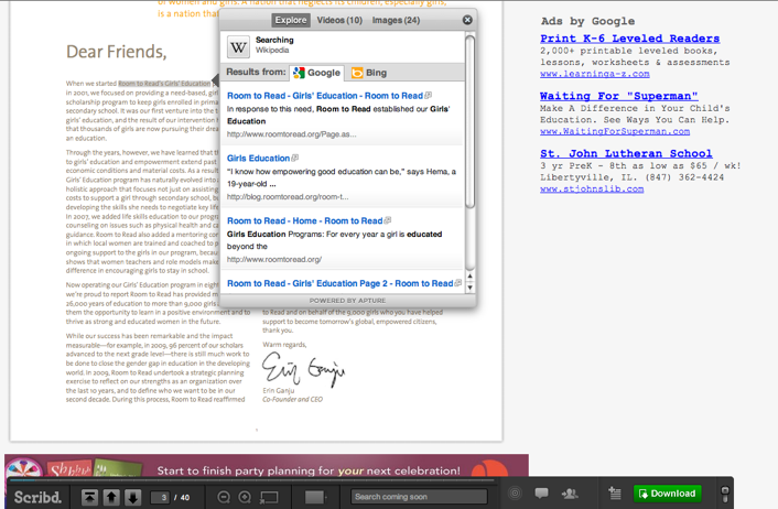Now, when users are reading documents, books, or other works on Scribd, they will be able to highlight any word, and Apture will open a small browser within the page to search for the additional information on Google, Bing or Yahoo.