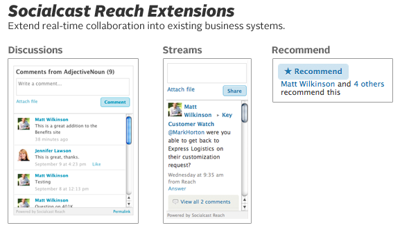 For Socialcast, which just raised $8 million in new funding, Reach hinges on the same opportunity that Facebook has developed for Facebook Connect, says Young. Reach allows Socialcast’s conversations to be leveraged within key work environments without having to distract employees with another program.