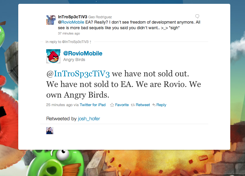 Apparently early reports caused some confusion as to who actually owned Angry Birds and the difference between developer Rovio and publisher Chillingo. To clarify, Angry Birds developer Rovio Mobile has just tweeted the above, “We have not sold out. We have not sold to EA. We are Rovio. We own Angry Birds.”
