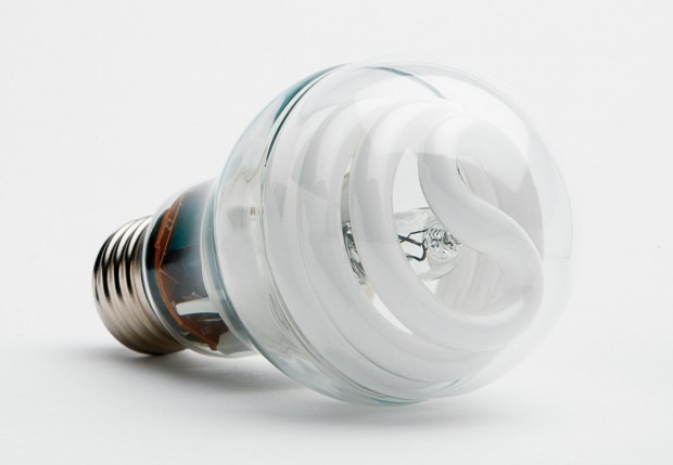 Well, GE has solved that problem, at least kind of, by putting a tiny halogen bulb in the gap between the fluorescent coils. Go ahead, zoom in, you can see it nestled in there.