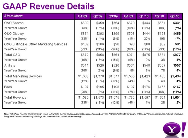 Update 10/21: Today, Yahoo spokesperson Mojgan Khalili responded to this post with three main points: Yahoo didn’t give up on search (we’ll just agree to disagree there), it makes more money from display than Google, and it is growing faster in display than the overall market. She writes: