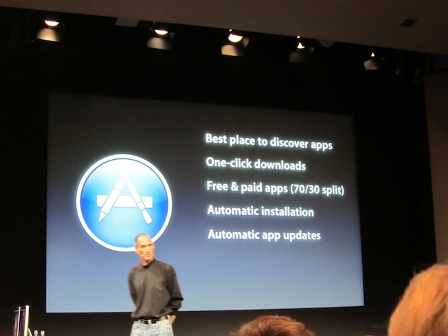Some of these features were then demoed on stage. Multi-touch gestures are key to a lot of what’s new. And, of course, the Mac App Store. It will have the same mixture of free and paid apps as the App Store we all know, the same one-click downloads, the same automatic updates, and the same 70/30 split on revenue for developers.
