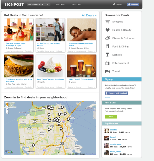 Wall says that in cities like New York and San Francisco, there are many thousands of deals and discounts being offered at local businesses on a daily basis — there just hasn’t been a good way to sift through them. To help users filter through the noise on Signpost, users can vote on each deal to determine if it’s any good (you can also verify that a given deal exists, to weed out any possible spam). And while the site isn’t directly targeting merchants yet, local businesses are free to post their own deals themselves, though there’s no guarantee they will be voted up.