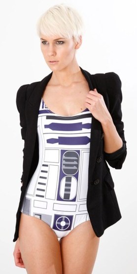 This R2-D2 swimsuit is the usual Lycra construction, with UV-blocking fibers and all that other stuff that’s in pretty much every swimsuit now. It costs $85 over at Black Milk Clothing. I don’t know if that’s a lot or not. What do girls pay for their swimsuits? I don’t even know where my swimsuit is.