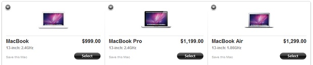 That line is nearly gone at least regarding Apple’s three notebook groupings. Now, there’s a 13-inch notebook option at $999, $1,199, and $1,299. That move takes a page out of HP’s playbook, a company notorious for flooding the the market with lots of options with similar prices. There’s the $999 MacBook with a 10-hour battery life, Core 2 Duo CPU, 2GB of RAM and 250GB hard drive followed up by the nearly identical Macbook Pro with 4GB of RAM and unibody construction MacBook Pro. Lastly, there’s the mid-level MacBook Air with a 7-hour battery, slightly slower Core 2 Duo CPU and 128GB flash storage.