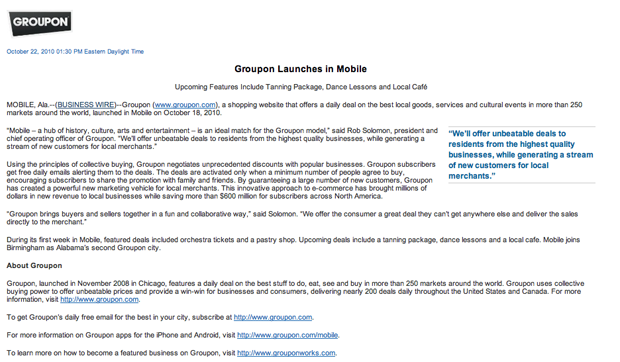 MOBILE, Ala.–(BUSINESS WIRE)–Groupon (www.groupon.com), a shopping website that offers a daily deal on the best local goods, services and cultural events in more than 250 markets around the world, launched in Mobile on October 18, 2010.