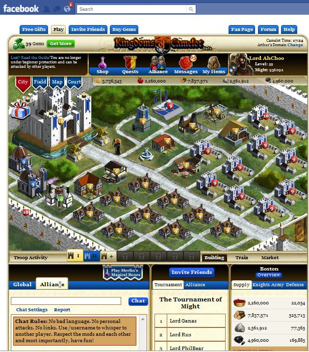 Now Kabam is focused on real-time strategy games like Kingdoms of Camelot, which CEO Kevin Chou describes as a mix of Starcraft (it’s real-time) and Civilization (there’s an empire-building mechanic). There’s also social features, including an ‘alliance’ system that lets friends band together (he says around 50% of alliances are between people who are actually friends on Facebook, while the other half are for people who met online). Kingdoms of Camelot now has 6 million players monthly, some of whom are very engaged — 10% of players spend more than six hours a day playing the game.