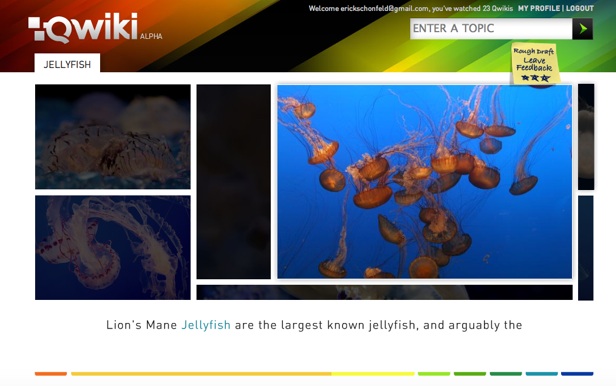 Qwiki is somewhere in between a visual search engine and a highly interactive and entertaining Wikipedia. It assembles information on the fly for millions of topics, bringing together images and text in a truly magical way. I’ve been playing around with it and learning all about Jellyfish, Kanye West, black holes, Thomas Keller’s Per Se restaurant, Google exec Marissa Mayer (who was one of the finalist judges), great white sharks,, and even my hometown.