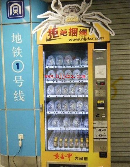 We have covered the one or the other obscure vending machine in the past, but this one’s a first: a vending machine that sells live crabs. This model is located in a subway station in Nanjing, China, and keeps the crabs at 5°C at all times. In other words, the crabs inside are alive, “hibernating” in a frozen state.