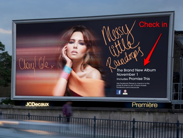 In a new outdoor campaign across the UK for British singer Cheryl Cole, who has a new album coming out and a concert tour, fans who check into the billboard will be taken to her Facebook page and get a chance to win two free tickets (plus travel and hotel) to one of her X Factor shows. The campaign was designed by Mediacom and Polydor Records.