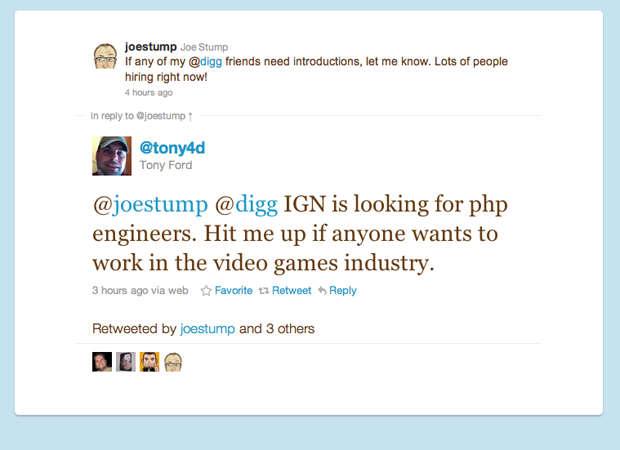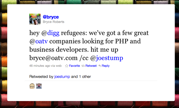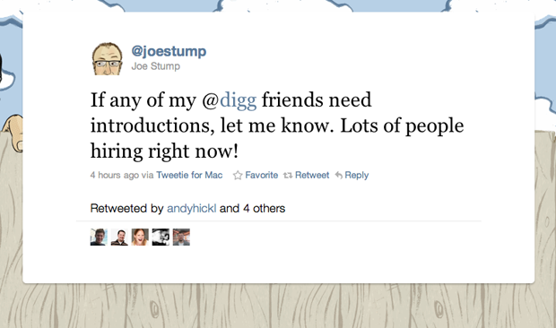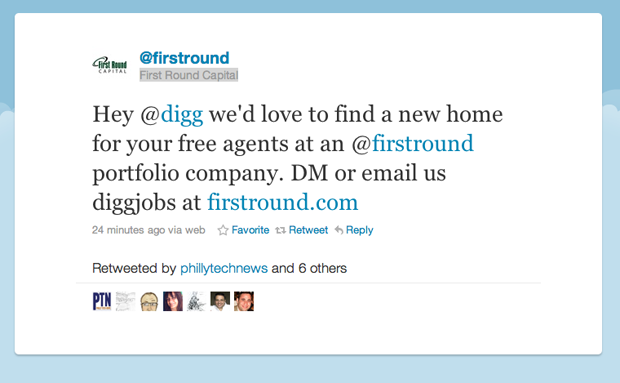 While the usual armchair Twitter quarterbacks responded to the what the layoffs mean for the ailing site, another more positive trend was also evidenced; People making it clear that the kind of top tier engineering talent that worked for Digg was welcome at a spectrum of high profile startups and full fledged techcompanies.