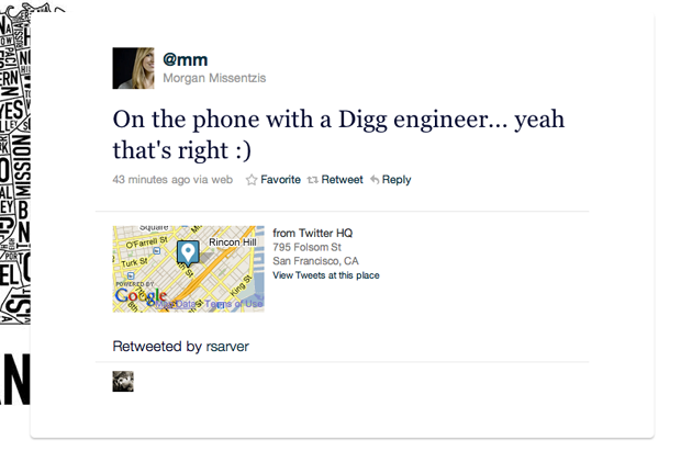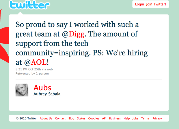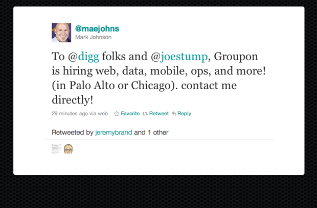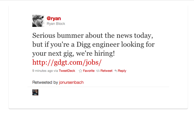 As I’m hearing that the talent pool of experienced engineers in the Bay Area is currently in short supply, this layoff might be a boon for local startups looking to add skilled staff. Some of the companies that have already expressed interest in hiring include Twitter (above), Groupon, GDGT, O’Reilly Alpha Tech Ventures, IGN, Styleseat, various First Round Capital portfolio companies, our parent company Aol and AT&T Interactive.