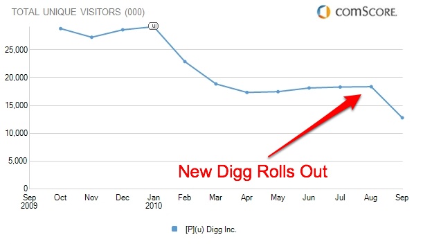 How bad did it get? Here’s one data point from comScore: Digg lost 30 percent of its audience in the month of September alone. Digg’s estimated unique visitors worldwide went from 18.4 million in August to 12.8 million in September. That is a drop of 5.6 million people in a single month. Remember, the new site went live for everyone on August 25, so September was the first full month of the new design. Compared to a year before, Digg’s worldwide audience shrank by 16 million visitors.