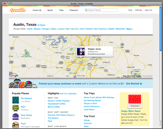 Gowalla will now include City Pages for more than 30 metro areas worldwide. For a given metropolis, Gowalla will combine all of the most popular happenings, places, and activities in a single page, courtesy of the network’s Highlights feature. City Pages will also include a map of local activity that shows where the most check-ins are taking place and includes the best spots that are highlighted by other users. Since Highlights launched, more than 10,000 Passport Holders have added 30,000 Highlights worldwide. So for example, the Austin city page will list the top food destinations, the best live music, the most popular places (according to check-ins) and more categories of destinations.