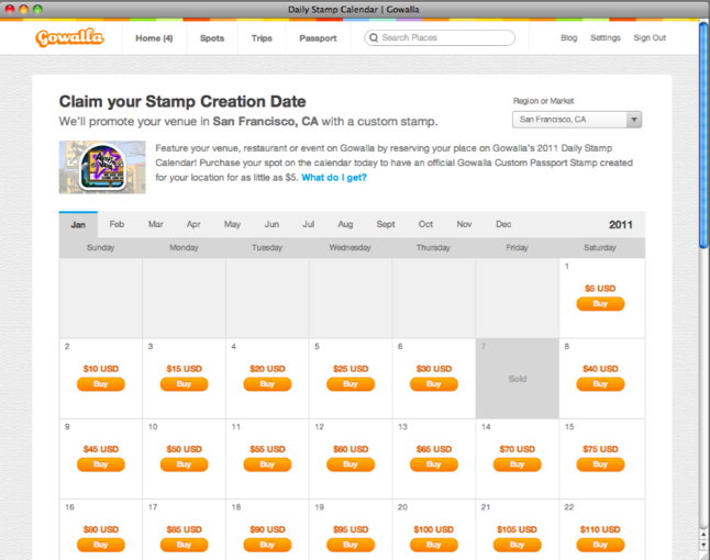 Gowalla has included this feature for some time, but has been implementing this on a case-by-case basis. Now these custom badges are part of a self-serve platform. While these custom badges previously sold for a few thousand dollars a piece for businesses, Gowalla is will begin charging verified businesses $5 per day for custom badges (the price will go up by $5 as a business publishes more unique badges within a month, says founder and CEO Josh Williams). Eventually this feature will be rolled out to other cities. Via a “Stamp Calendar,” businesses can reserve certain times for their custom badges to be promoted.