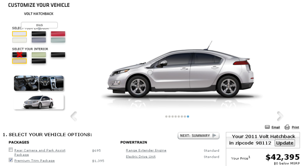 The time has come to fiddle around with all the options for your new Chevy Volt. Assuming you’ve got a spare $42K laying around. Yes, it’s not exactly the most affordable vehicle, nor is it, strictly speaking, an electric vehicle, but it is a practical, good-looking, and high-tech car, which is perhaps better. At any rate, the official configurator is now live, and you can add and subtract trim as you please.