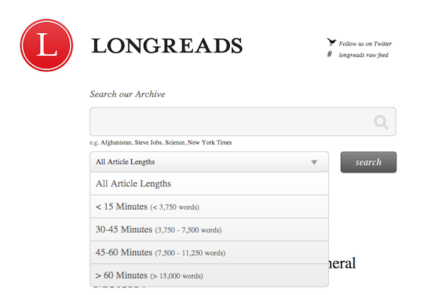 The main purpose of longreads.com is to serve as an aggregator and archive for the service. Notably, it has a nice big search box that lets you search for long articles by topic or source. And you can filter articles based on what length you’re looking for.