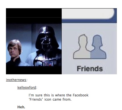 Ever wonder what the inspiration was for the Facebook Friends icon, the one with the outline of two people side-by-side? Neither have I. But now that Foursquare founder Dennis Crowley put up this side-by-side comparison of images on his Tumblog, I will never be able to look at the outline of the woman friend’s bob haircut again without thinking of Darth Vader’s helmet.