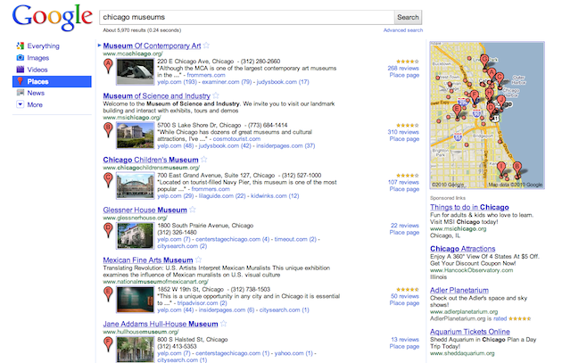 While it’s in the process of rolling out, you can use this link to see what it will look like. As you can see, a search for “Chicago museums” will bring up seven or so museums place pages it believes you may be looking for. If you want more of these place suggestions, you can click on the “more results” link at the bottom of the seven. Or you can click on the Places left sidebar item.