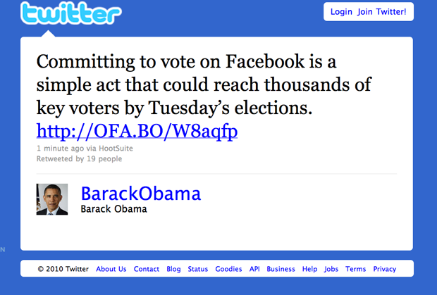 In an effort to increase voter turnout for next Tuesday’s Congressional Election, President Barack Obama has put out a call on Twitter for constituents to install a Facebook application called the “Commit to Vote Challenge.” Like a more noble version of Fast Company’s Influence Project, the Commit to Vote Challenge takes advantage of the “network effect” by using Facebook to spam your friends about voting. Facebook’s population is currently greater than that of the United States.