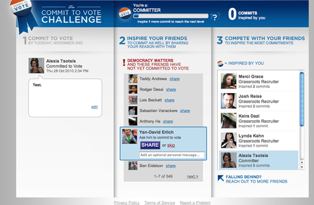 Right now according to the app, I’m a humble “Committer” and all I need to “reach the next level” is inspire just one more friend to vote. I can also “compete with my friends to inspire the most commitments” which is a serious case of social gaming mechanics taken too far. Paid for by the DNC and Organizing for America, I bet this thing is assuming your Facebook friends are Democrats.