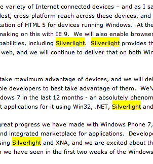 Ballmer, meanwhile, probably added a number of those “Silverlight” references into his statement following the uproar. Silverlight. Silverlight. Silverlight. Silverlight. Silverlight. Is dead. Long live Silverlight! Or something.