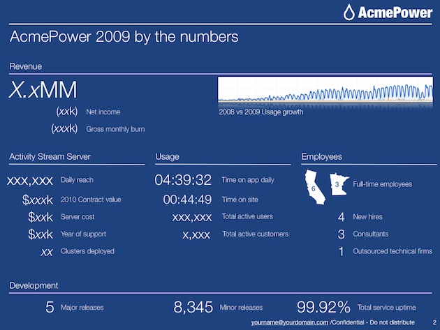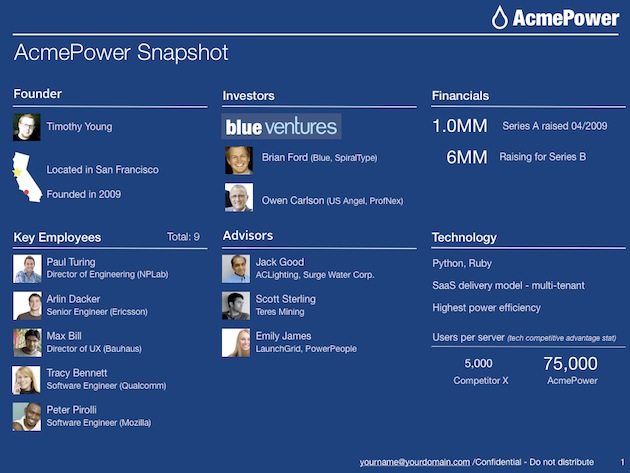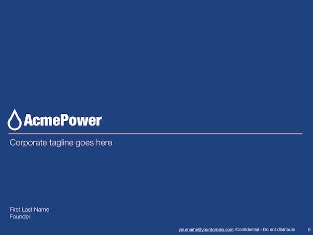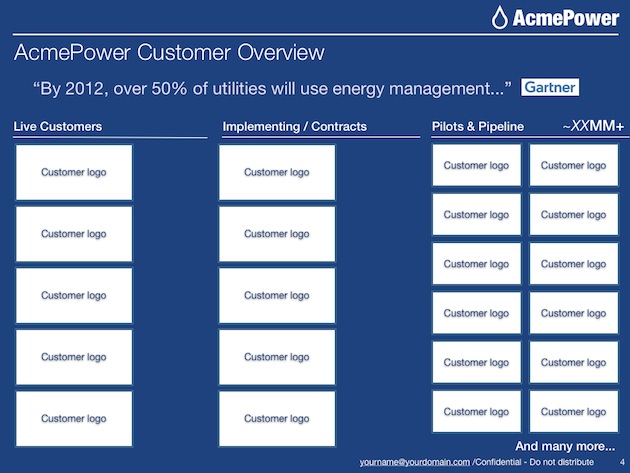 I created the following slides directly from my actual pitch decks just swapping out confidential details and people.AcmePower is a fictitious company.
