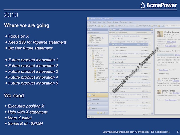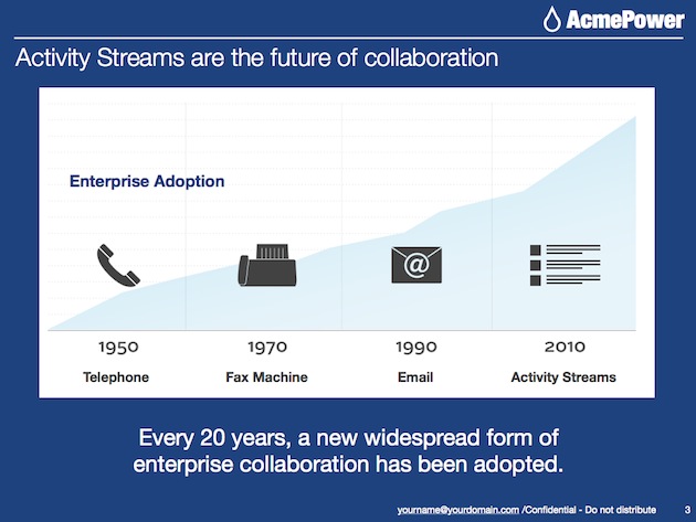 Humans love patterns. It is how we interpret the world. It takes time and research to put this slide together but it has turned out to be the most valuable. I have known 5 other startups in the past 6 months who have used this slide type and all have been successful in raising capital. I view this as the most important slide in the entire deck. Here you are setting up the trend pattern and then move right into the demo. This creates a powerful narrative where you tell them you know the future and then move right into showing them the future with your demo. Note: Below I used the actual slide from my Socialcast deck covering the rise of activity streams.