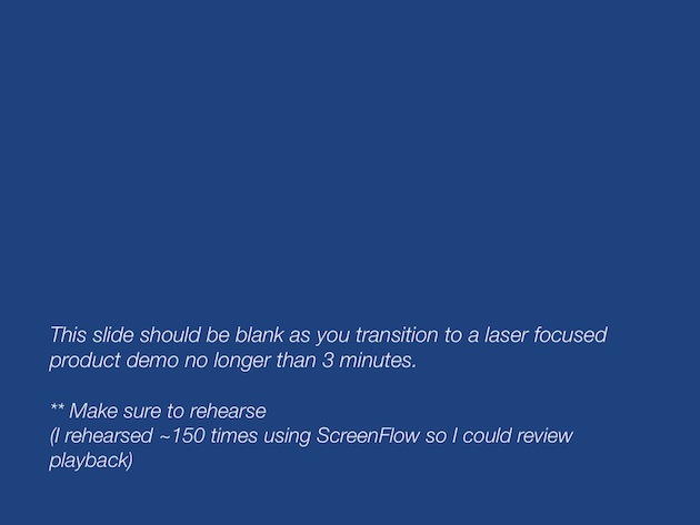 Whether pitching to a single partner or to the entire partnership of a firm, there were times where I wanted to make a point but someone always wanted to go back and discuss the current or previous slide. After this happened twice, I adapted my presentation to incorporate blank slides. I would literally insert blank slides in my deck where I wanted to make a strong verbal point or transition. The blank slide immediately brought everyone’s attention back to me. I would use blank slides sparsely as you do not want to overdo it (they’re used for dramatic effect). In my initial meeting five slide deck, I used a blank slide to transition to a short product demo in the middle of the presentation.
