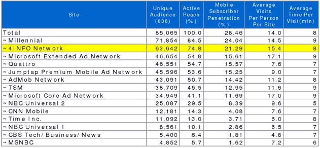 In a recent Nielsen report for US mobile display advertising, 4INFO tallied more than 63 million uniques for the month of September, or roughly 75% of the market. That put them in second place, ahead of Microsoft’s Extended Ad Network, Quattro, AdMob and Jumptap. Millennial was number one with 72 million uniques.