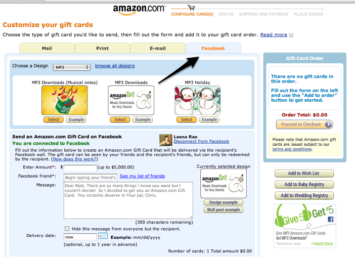 To encourage shoppers to use the new feature, the first 10,000 customers who give an MP3-themed Amazon.com Gift Card to five different Facebook friends will get a $5 credit good for music downloads at Amazon MP3.